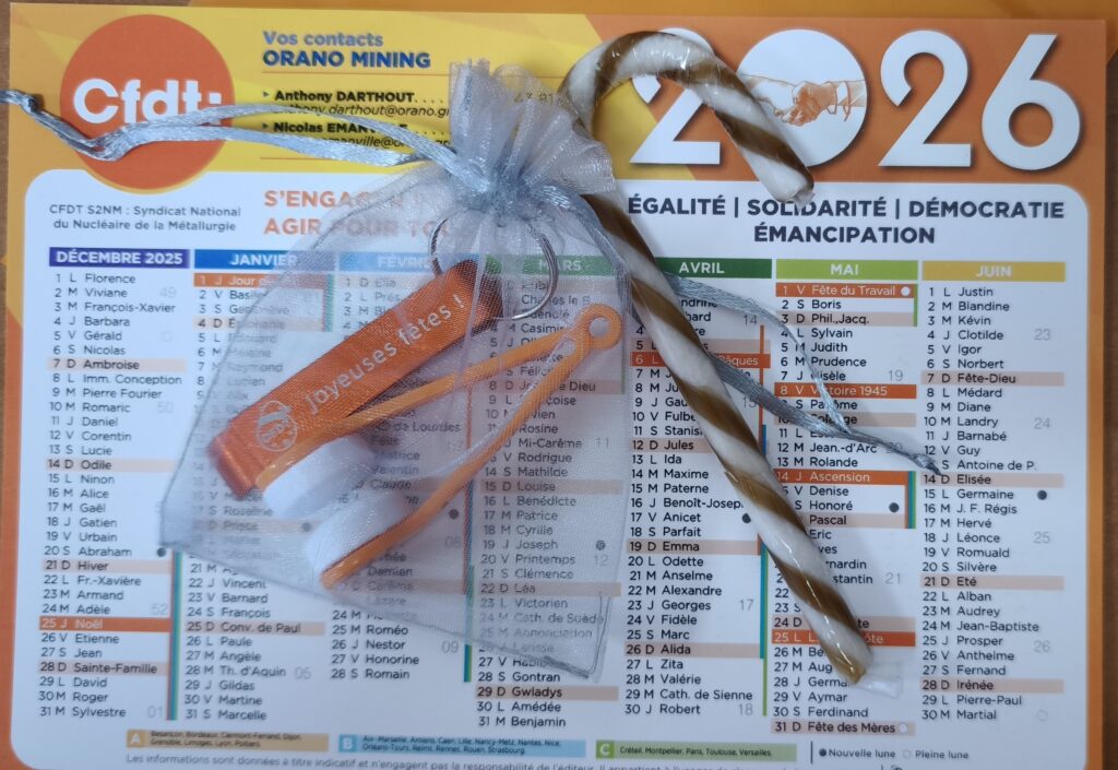 Voici une belle initiative de la section CFDT de Bessines, distribution de goodies de fin d’année et tract de communication sur les NAO 2026 pour les salariés Orano Mines.